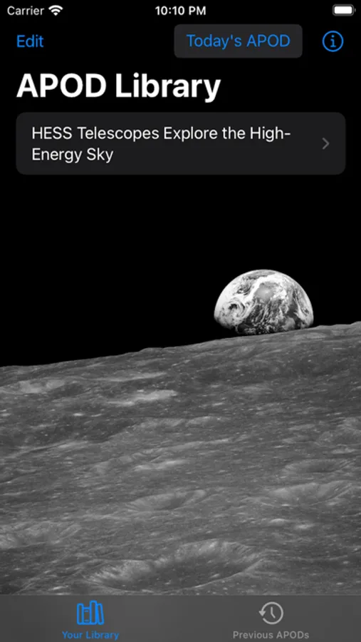 SpacePhoto lets you save daily APODs (Astronomy Picture of the Day), to your library and access them whenever you want to! APODs are daily photos (or videos), uploaded by NASA of the universe, earth, stars, planets, and other astronomical phenomena with their description.