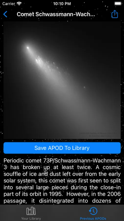 SpacePhoto also allows you to export and save each APOD photo to your iOS Photo Library and share them with friends or family!
