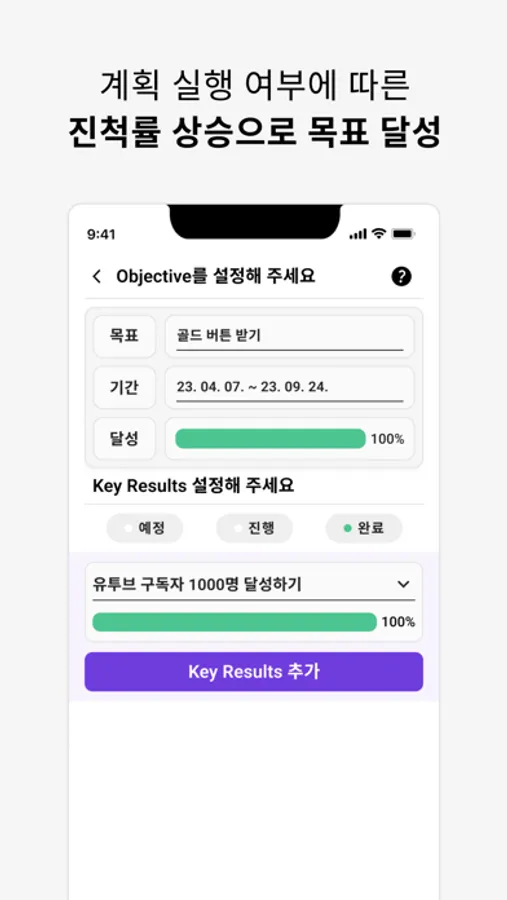 저희 서비스는 OKR프로세스를 적용해서 개인이 달성하고자 하는 목표와 구체적인 계획을 세우고 보다 효과적으로 목표를 달성할 수 있도록 달성률을 측정할 수 있도록 하였습니다.