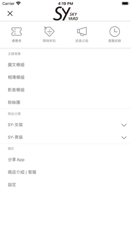點開SKY YARD,掌握最新資訊,全方位平價優質服飾,輕鬆點選,便利結帳,快速到貨。
