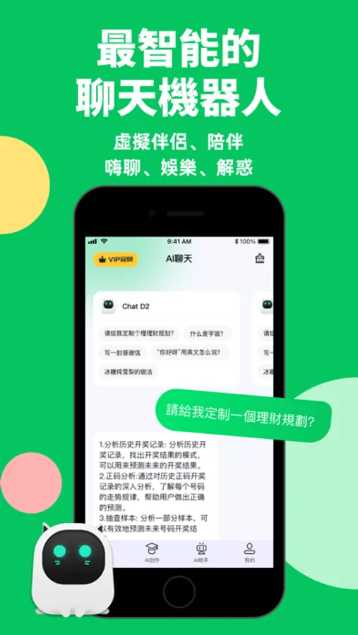 擁有ChatD2,你就擁有了你專屬的智慧聊天機器人,聰明而强大ChatD2可以幫你解决各種問題: 最聰明的聊天軟體:它能够類比美女、帥哥陪你一對一聊天,真實自然的和你進行人機對話。 而且它無比聰明還能自我學習成長,回答您各種各樣的問題。