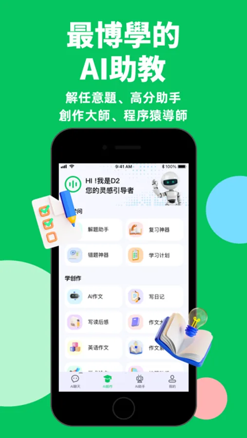 最聰明的智慧助教:ChatD2博學多識,可以幫您解答和講解各類學科的難題,還是個大師級的創作者幫您提供靈感寫作文、寫小說,還是個會各種開發語言的程式設計高手。