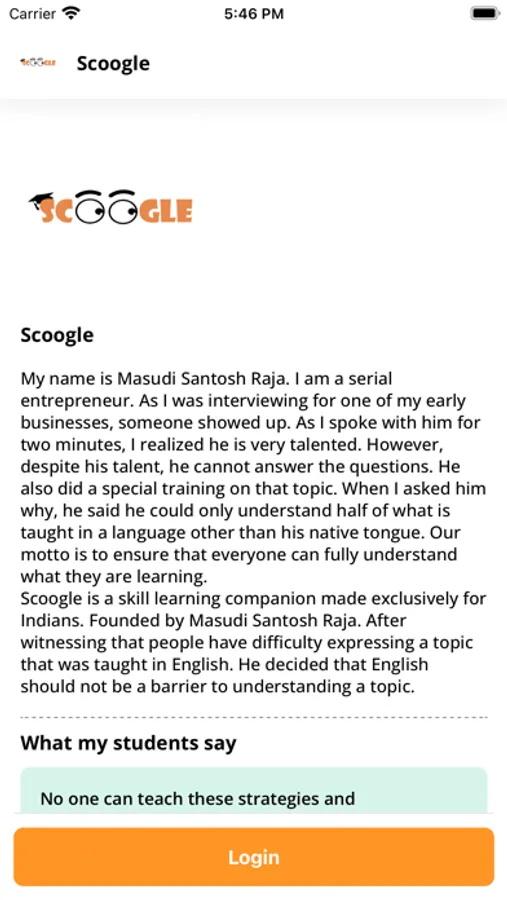 Scoogle is a skill learning companion made exclusively for Indians. Founded by Masudi Santosh Raja. After witnessing that people have difficulty expressing a topic that was taught in English. He decided that English should not be a barrier to understanding a topic.
