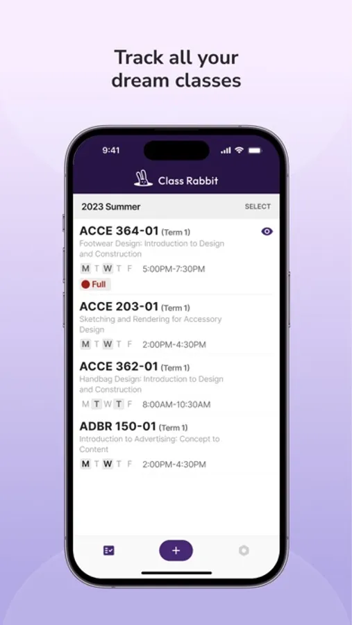 "Introducing ClassRabbit - the mobile app that helps you keep track of your desired classes like never before! With our innovative tool, you can monitor seat availability and receive push notifications as soon as a spot opens up. Whether you're a busy student or a working professional, ClassRabbit simplifies course scheduling by providing you with the information you need to make informed decisions.