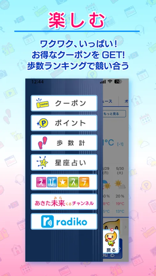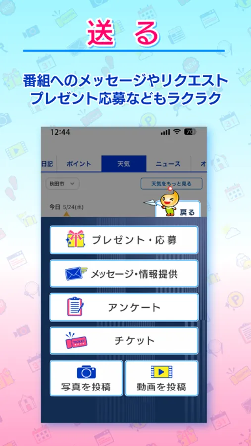 さらに、番組へのメッセージ投稿や動画・写真の投稿、プレゼント応募も簡単にできるようになりました。毎日使うとポイントが貯まり、様々な商品に応募することができます。秋田県内のお店で使えるお得なクーポンも掲載しています。
