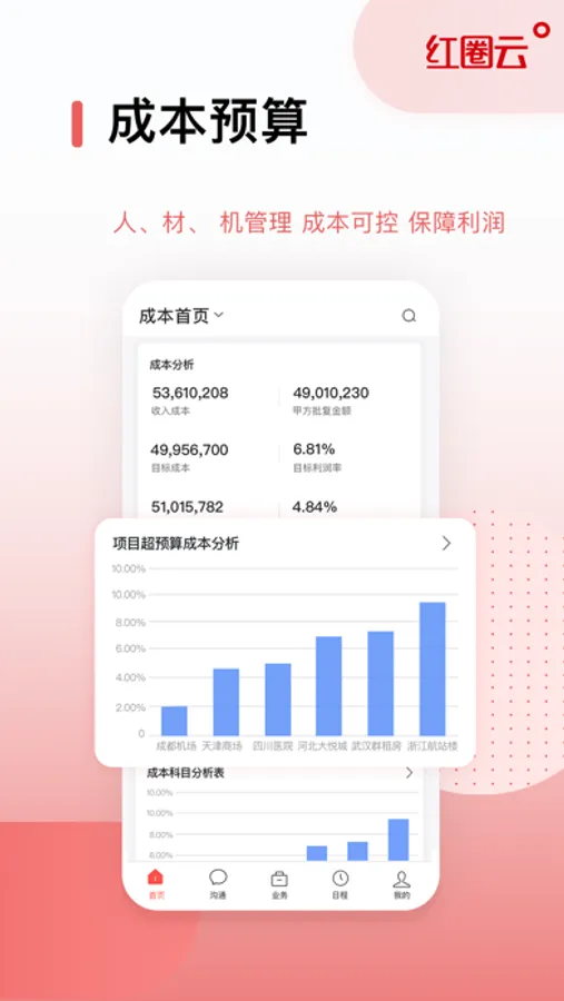 红圈云秉承以项目为中心的理念,涵盖了工程行业的企业经营管理和项目管理:客户管理、供应商管理、合同资金管理、结算管理、收入和支出管理、人材机成本管理、项目现场管理、劳务管理、风险管理、协同办公管理及经营决策管理等功能,并基于房建、市政、公装、弱电等各细分行业行业特点开发了行业标准化解决方案。