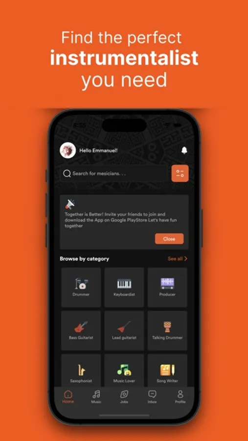 Connect with other musicians: Easily find other instruments around you, your favourite instrumentalists that you follow.