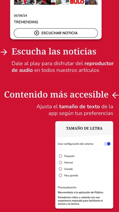 La nueva aplicación de Público no solo te permite navegar por los contenidos como lo harías en la web, sino que te ofrece una experiencia aumentada. Puedes escuchar las informaciones y opiniones que se publican, llevándote el análisis y las noticias a donde vayas, sin necesidad de leer. Esta función es perfecta para quienes desean estar informados mientras se desplazan, hacen ejercicio o simplemente prefieren la comodidad de un audio.