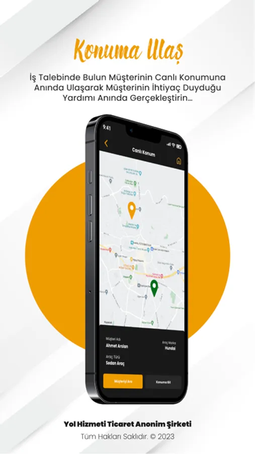 "YOL HİZMETİ" mobil uygulamasını telefonunuza indirin ve uygulamaya kayıt olun. Ardından ihtiyaç duyduğunuz her an Türkiye'nin dilediğiniz yerinde uygulama üzerinde almak istediğiniz yol yardım hizmetini seçin, konumunuzu belirleyin ve en yakın yol yardım ekibimiz en kısa sürede size ulaşsın.