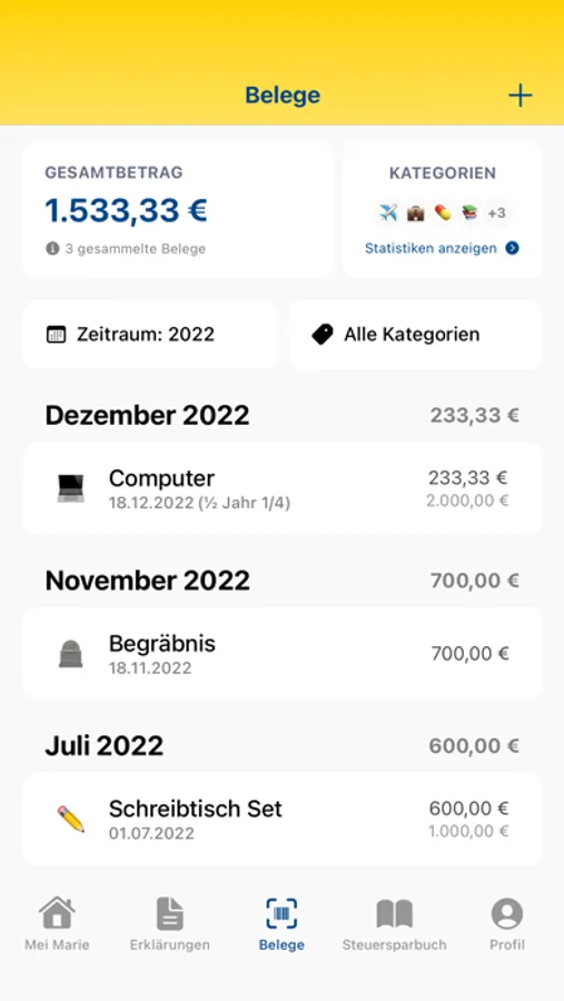 Marie Tipp: Das Finanzamt kann bei einer Prüfung nach allen Belegen zu deinen angemeldeten Kosten Fragen. Mit Mei Marie hast du alle Belege immer zur Hand!