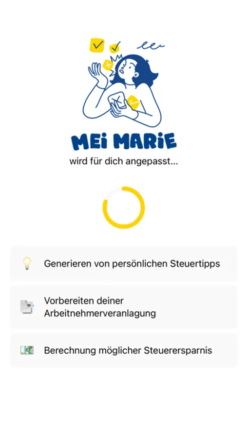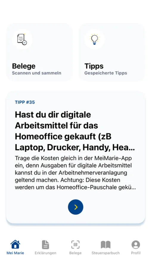 Dank der einfachen Handhabung und Expert:innentipps sorgt Mei Marie für eine möglichst hohe Steuerersparnis. Marie ist deine tägliche Begleiterin und hilft dir deine ANV spielerisch vorzubereiten, damit du die Einreichung in wenigen Minuten erledigen kannst. Schluss mit dem Belege-Chaos am Ende des Jahres.