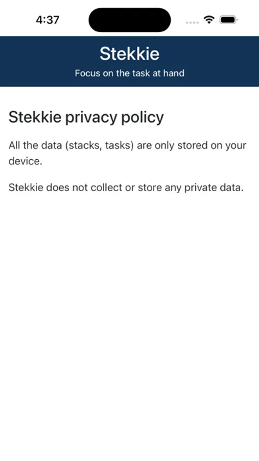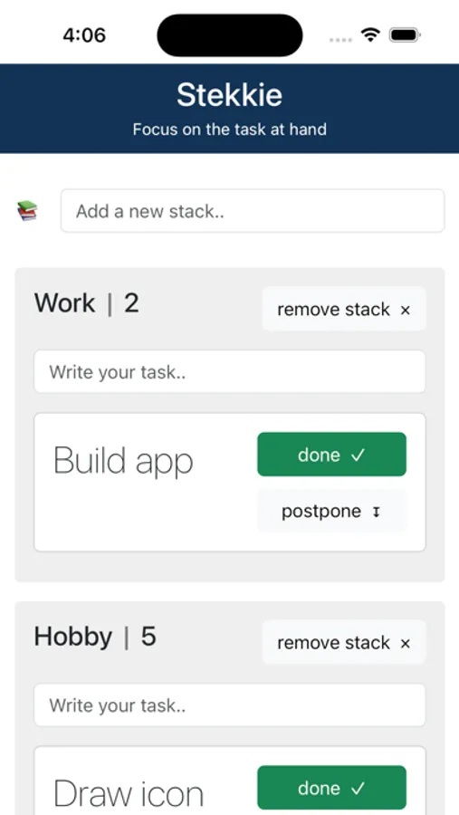 Stekkie helps you focus on the task that matters most. Put interrupting tasks on the stack. Once completed, continue where you left off.