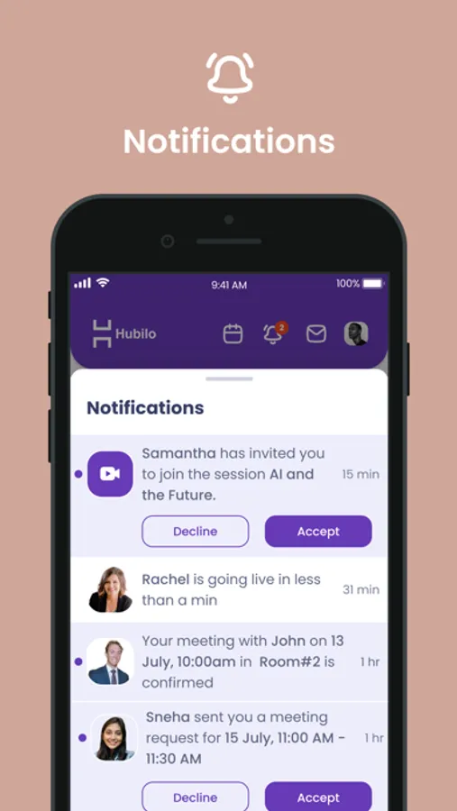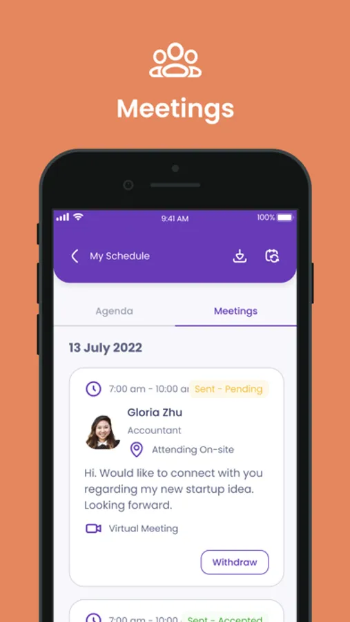 Set up meetings with potential attendees (investors, mentors, industry CxOs) by using the chat feature.