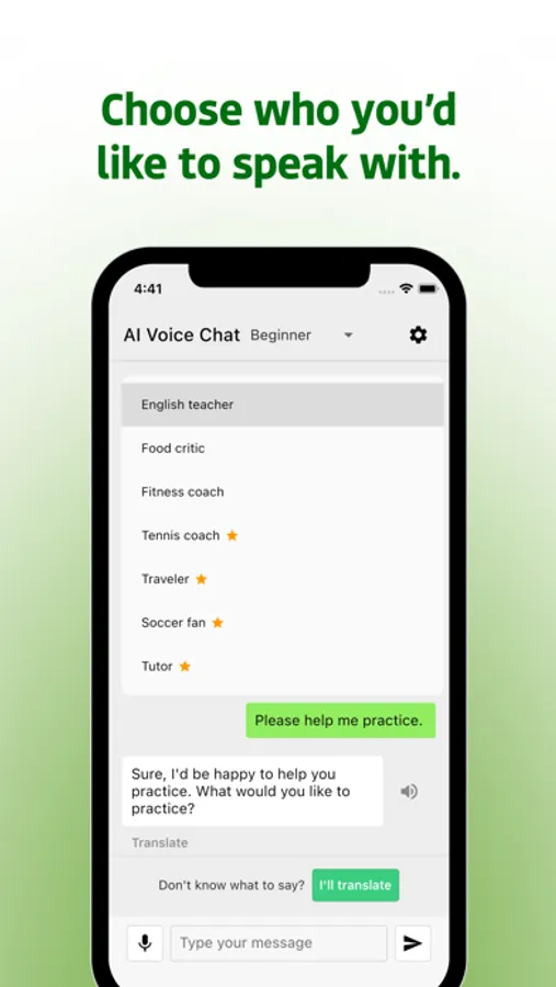 Diverse AI personalities: Choose from a variety of AI personas, including an English teacher, foodie, fitness coach, tennis coach, traveler, soccer fan, and tutor, to practice specific topics and make learning more enjoyable.