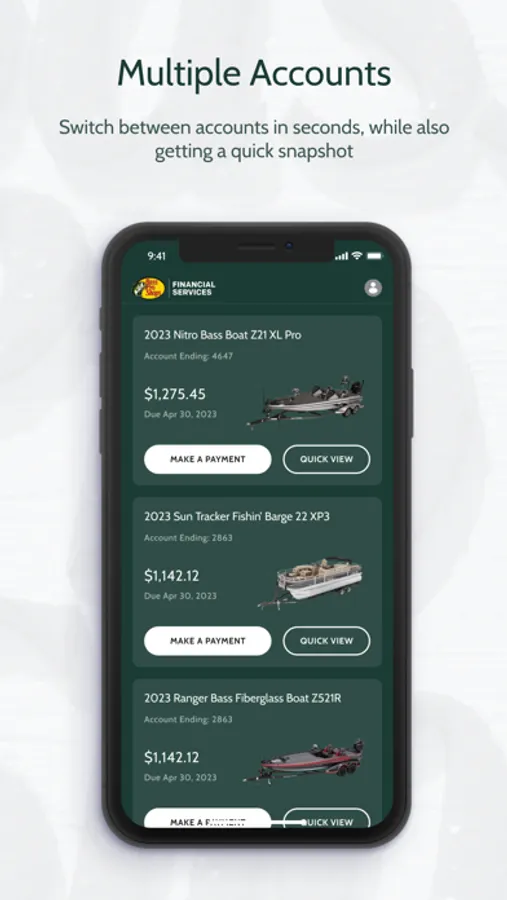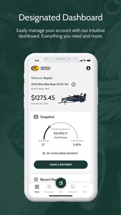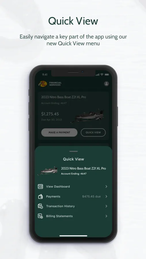 "Simplifying the management of your marine, ATV, or Side-by-Side loan, our new Bass Pro Shops Financial Services app allows for frictionless payments, enhanced navigation and a convenient Snapshot view of your account.