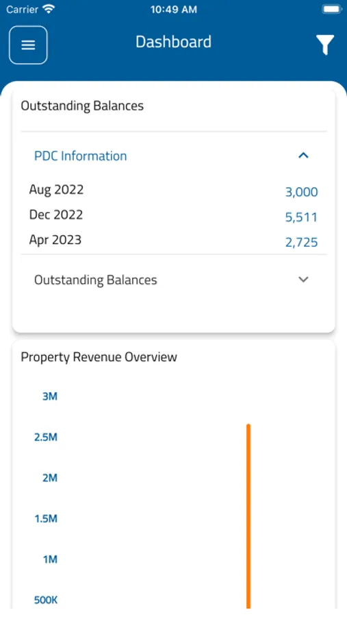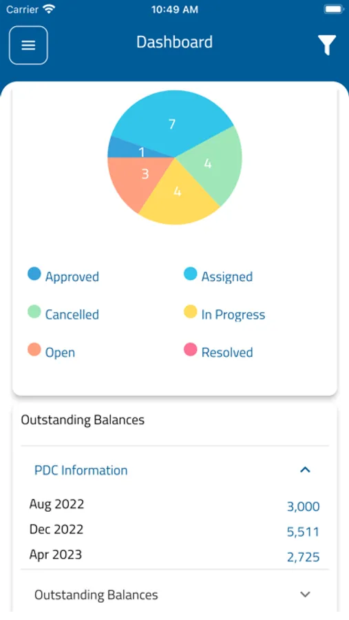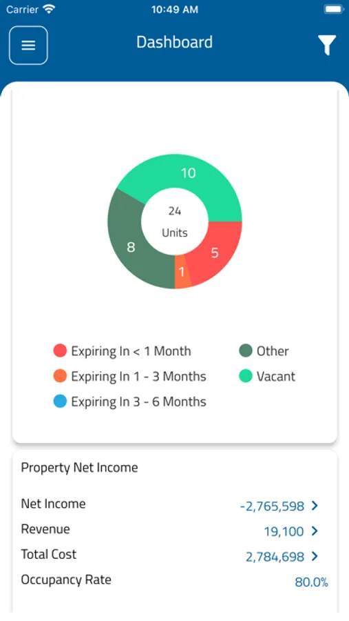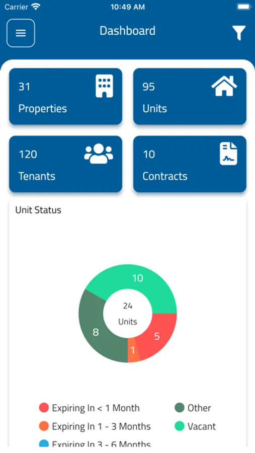 - Tenancy contract status with count of renewal, active, expired, legal case, expired, cancelled