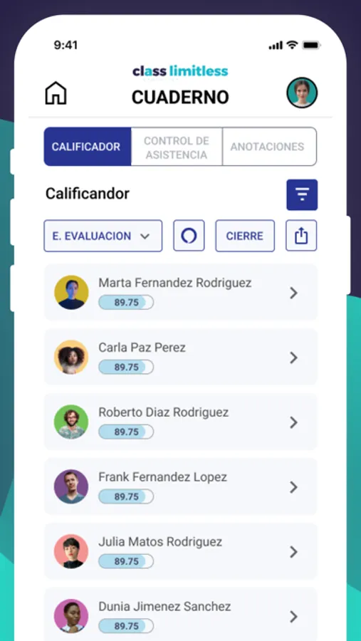 - Calificaciones: CLASS te mostrará en línea las calificaciones en tiempo real, conforme el profesor va ingresando calificaciones, CLASS te permitirá como estudiante visualizar los resultados de cada una de las evaluaciones realizadas.