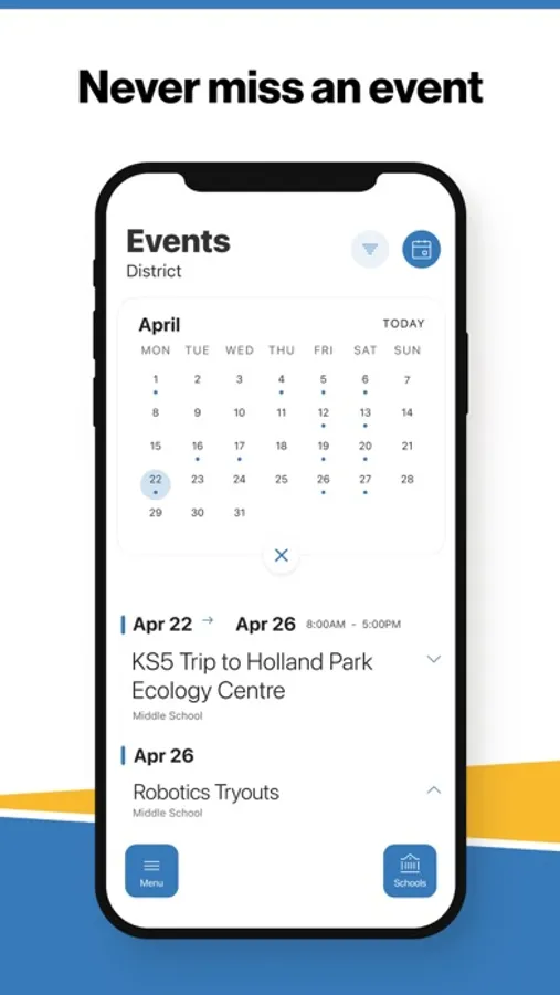 The event section shows a list of events throughout the district. Users can add an event to their calendar to share the event with friends and family with one tap.
