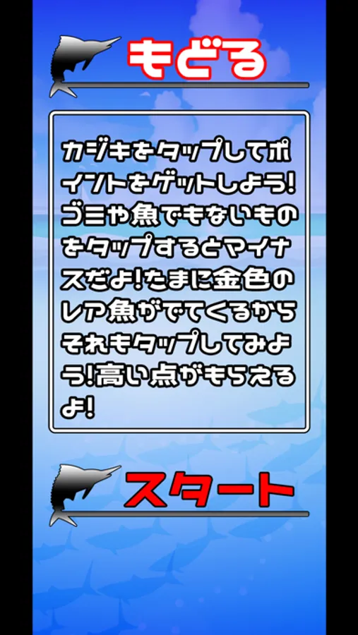 左から右に素早く流れる魚やゴミなどを見分けて素早くキャッチし、ポイントをゲットしていく簡単ゲーム!
