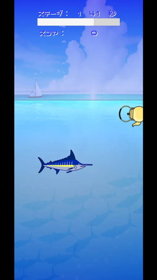 左から早いスピードの中で流れてくるカジキや金色の魚などレアな魚をたくさんゲットして高得点を目指そう!