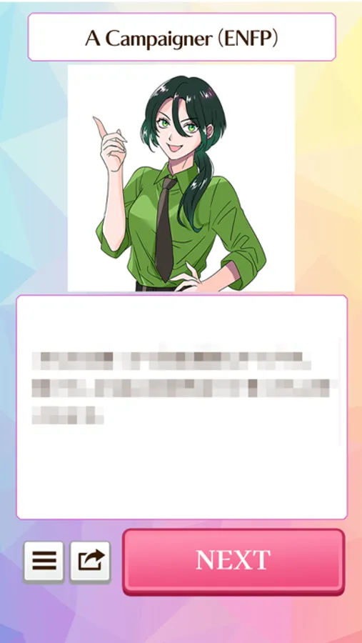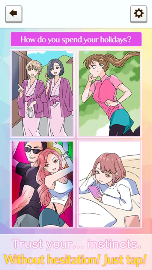 The"16 personality test in a snap”is a personality test that classifies your true self into 16 types based on psychology and economics.Unlike typical '16-Type Personality test’ ,The game is simplified by tapping on illustrations, allowing easy and enjoyment for the personality test!