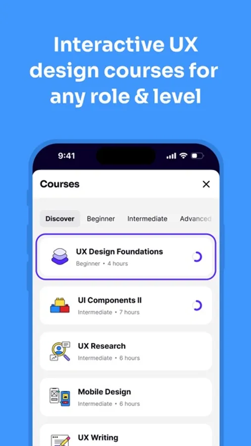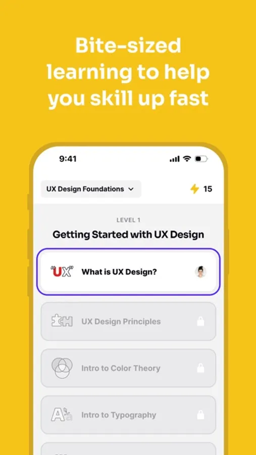 • We don't waste your time. Bite-sized learning lets you learn at your own pace and easily build a strong foundation in UX, UI, and product design skills.