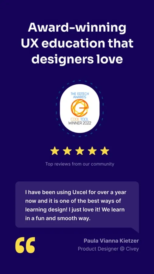 • "Uxcel really is the Duolingo of UX/UI! It makes it very easy to learn by chunks on a daily basis, so interactive and fun! And the content is extremely helpful, I've learned tons already! Very well invested money and time." — Diana Mancia, Product Designer.