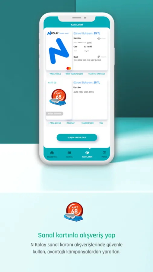 AKULAŞ uygulamasına hemen üye olarak N Kolay sanal karta sahip olabilirsiniz. Sanal kartınıza para yükleyerek ulaşımın yanı sıra internetten yapacağınız alışverişlerinizde de güvenle kullanabilir ve çeşitli kampanyalardan yararlanabilirsiniz.