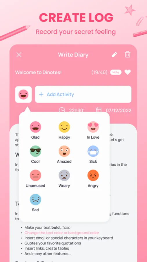 - Choose the emotional status and outstanding activity for your day: You will easily recall that day when re-reading your notes