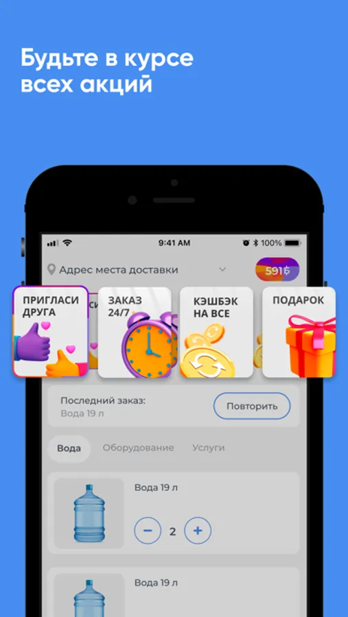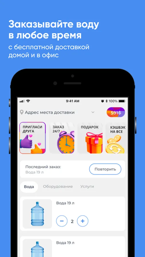 Водный мир — это сервис для заказа свежей питьевой воды и комплектующих.