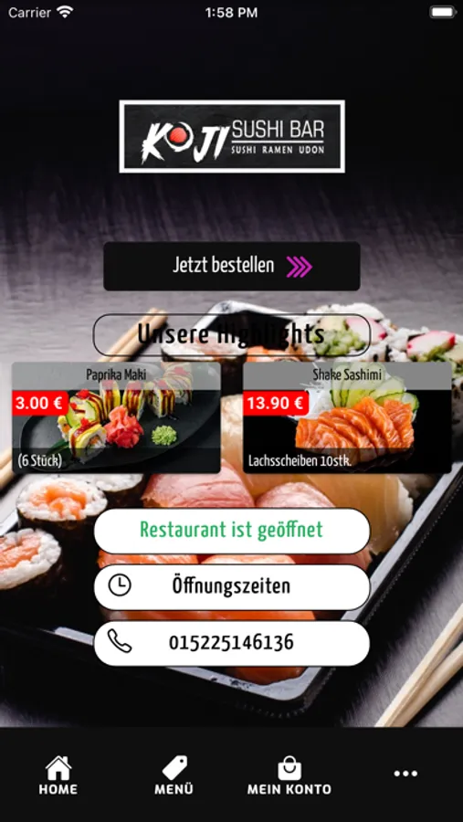 Herzlich Willkomen bei Koji Sushi Bar in Flörsheim am Main. Wir bedienen unsere Kunden mit Suppen, Sushi, Nigiri, Sushi Rolls Speisen und machen das seit mehreren Jahren aus Leidenschaft. Wir freuen uns immer wieder neue Kunden unsere Herkunft näher zubringen und möchten ihnen die Möglichkeit geben, ihre Bestellung unkompliziert und total einfach abzugeben. Aus diesem Grund, möchte wir ihnen unsere neue App und unseren Online Shop vorstellen, mit dem Sie problemlos über Paypal, Bar und Kreditkarte zahlen können.