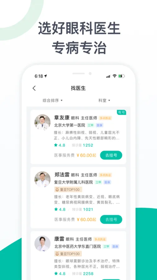 眼科医院挂号,专业眼科医院挂号平台,为患者提供方便快捷的儿科挂号就医渠道。拥有多个科室5000+医生号源;基于移动互联网医疗技术,提供三甲医院多点执业医生号源,方便患者挂号就医。眼科医院挂号,专业眼科医院挂号平台,为患者提供方便快捷的眼科挂号就医渠道。眼科的全称是“眼病专科”,是研究发生在视觉系统,包括眼球及与其相关联的组织有关疾病的学科。眼科一般研究玻璃体、视网膜疾病,眼视光学,青光眼和视神经病变,白内障等多种眼科疾病。