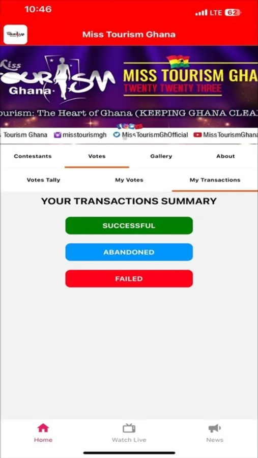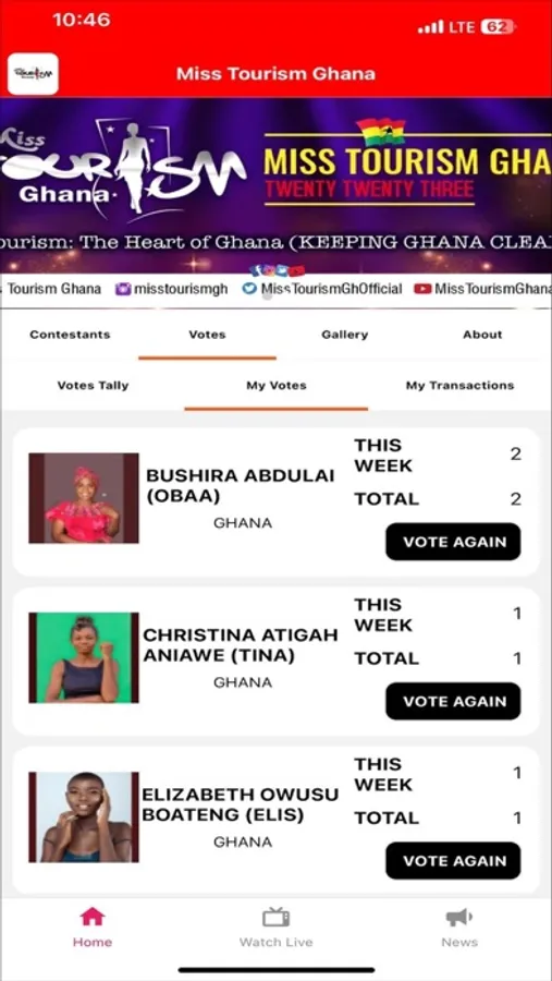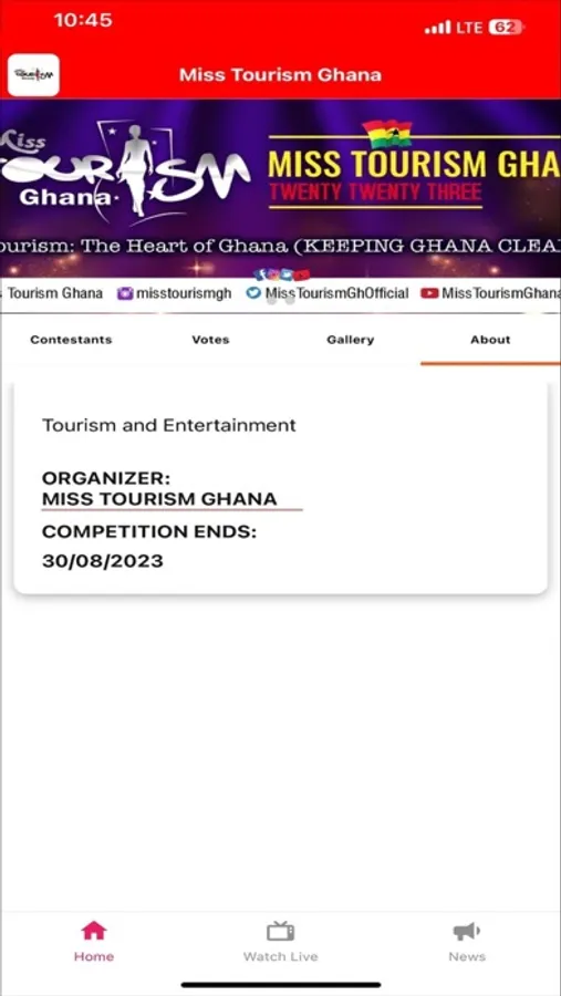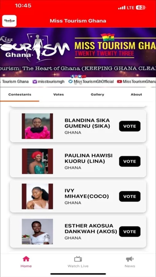 The Miss Tourism Ghana App is your platform to participate in the Miss Tourism Ghana competition. Stay updated with real-time voting results, explore contestant profiles, and connect with fellow fans. Join us in celebrating Ghana's beauty and supporting the future of tourism. Download the app now and be part of this exhilarating journey. Your vote counts!