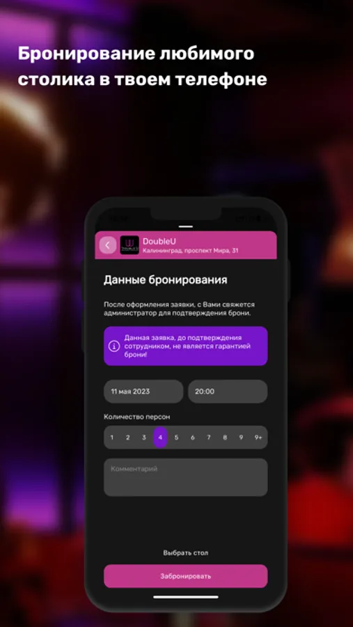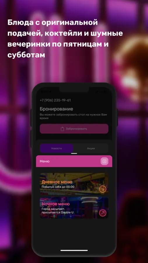 Приложение DoubleU дает возможность бесплатного входа в наш клуб, а также бронирования столиков и получение последних новостей.