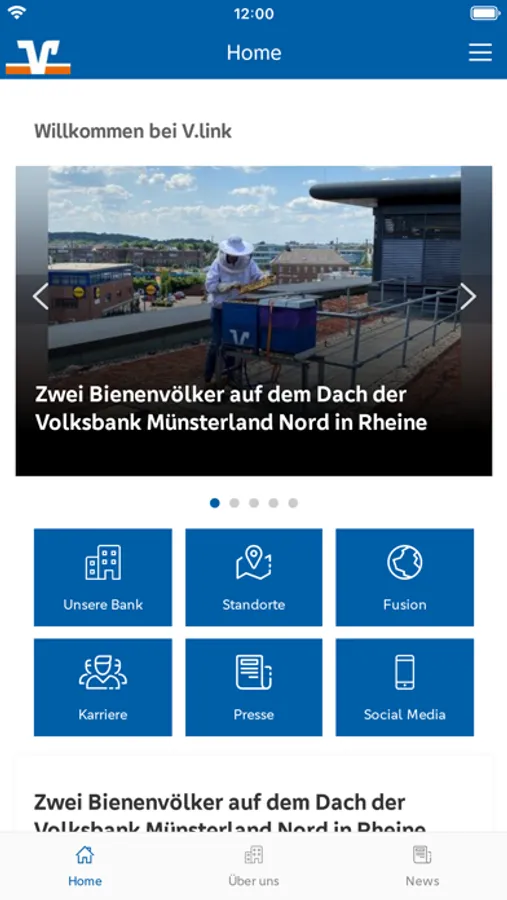 V.link ist die Kommunikations-App der Volksbank im Münsterland eG. Der Name der App - V.link - steht dabei für "flinke Kommunikation". Mobil, modern und schnell. V.link bietet Informationen und Neuigkeiten für unsere Mitarbeitenden sowie für Mitglieder, Kunden und unsere Region, zum Beispiel: