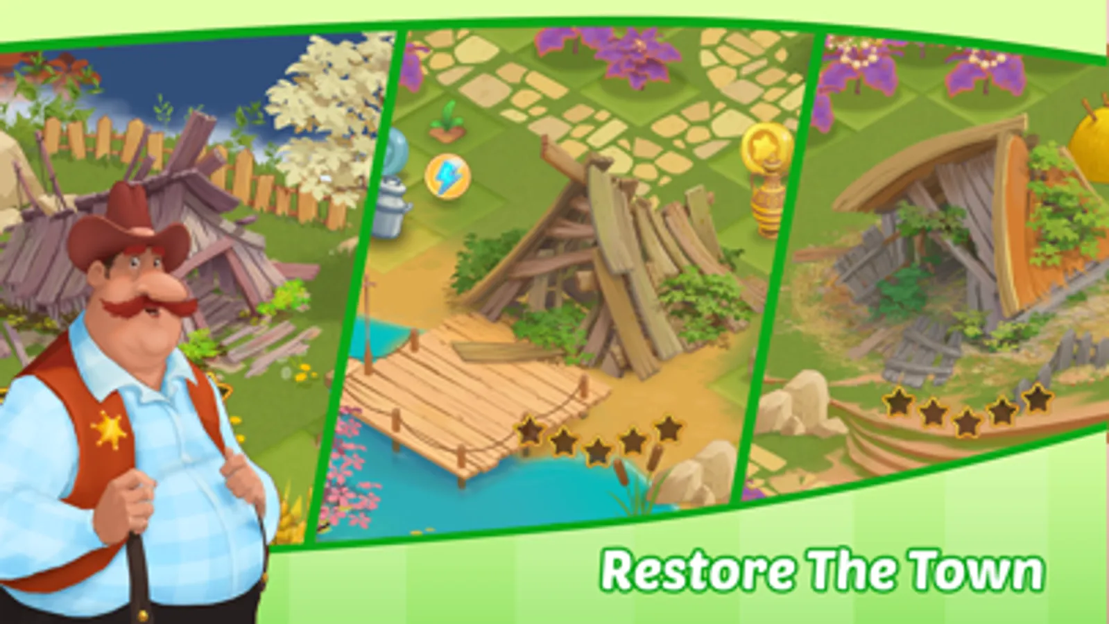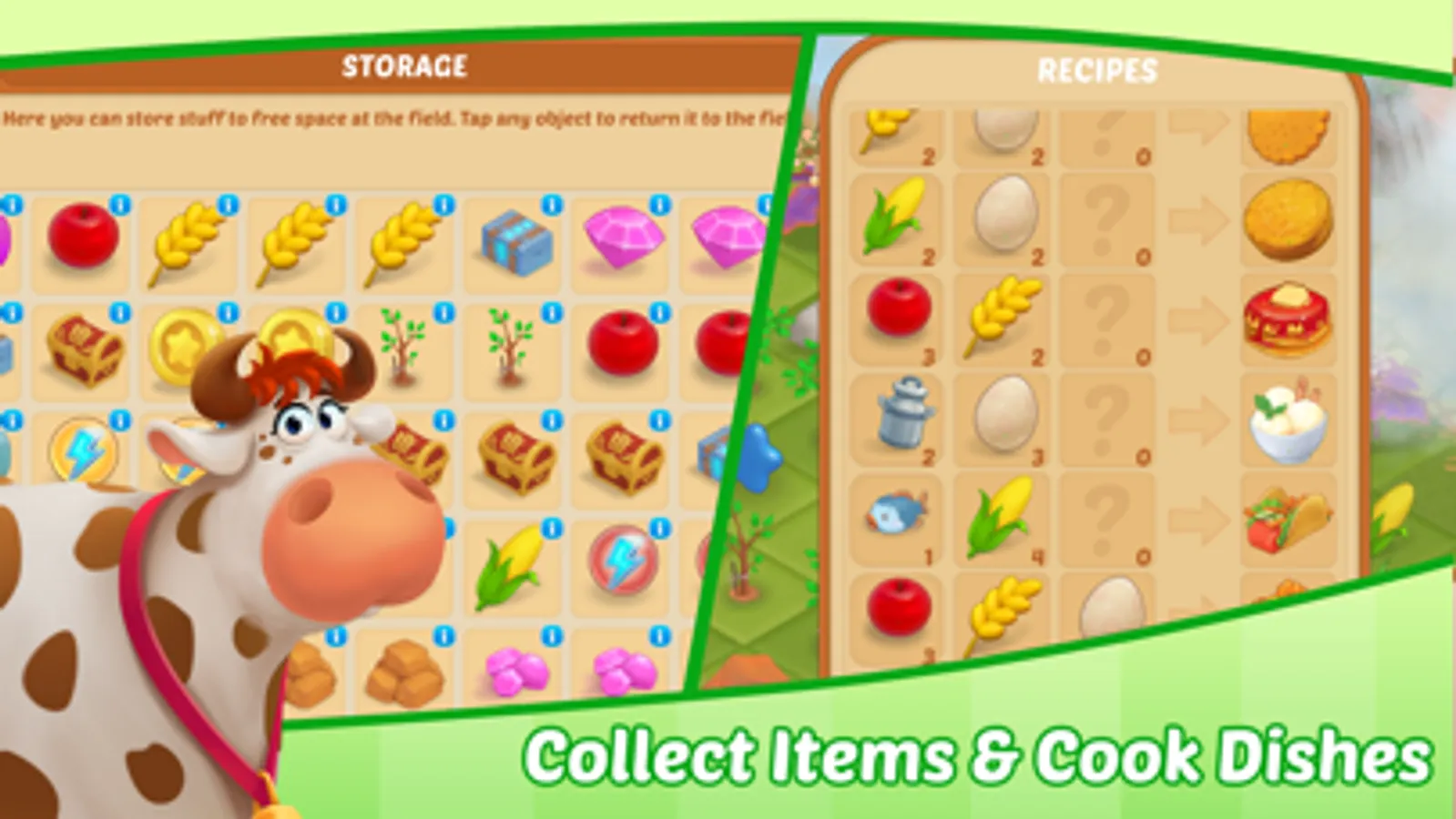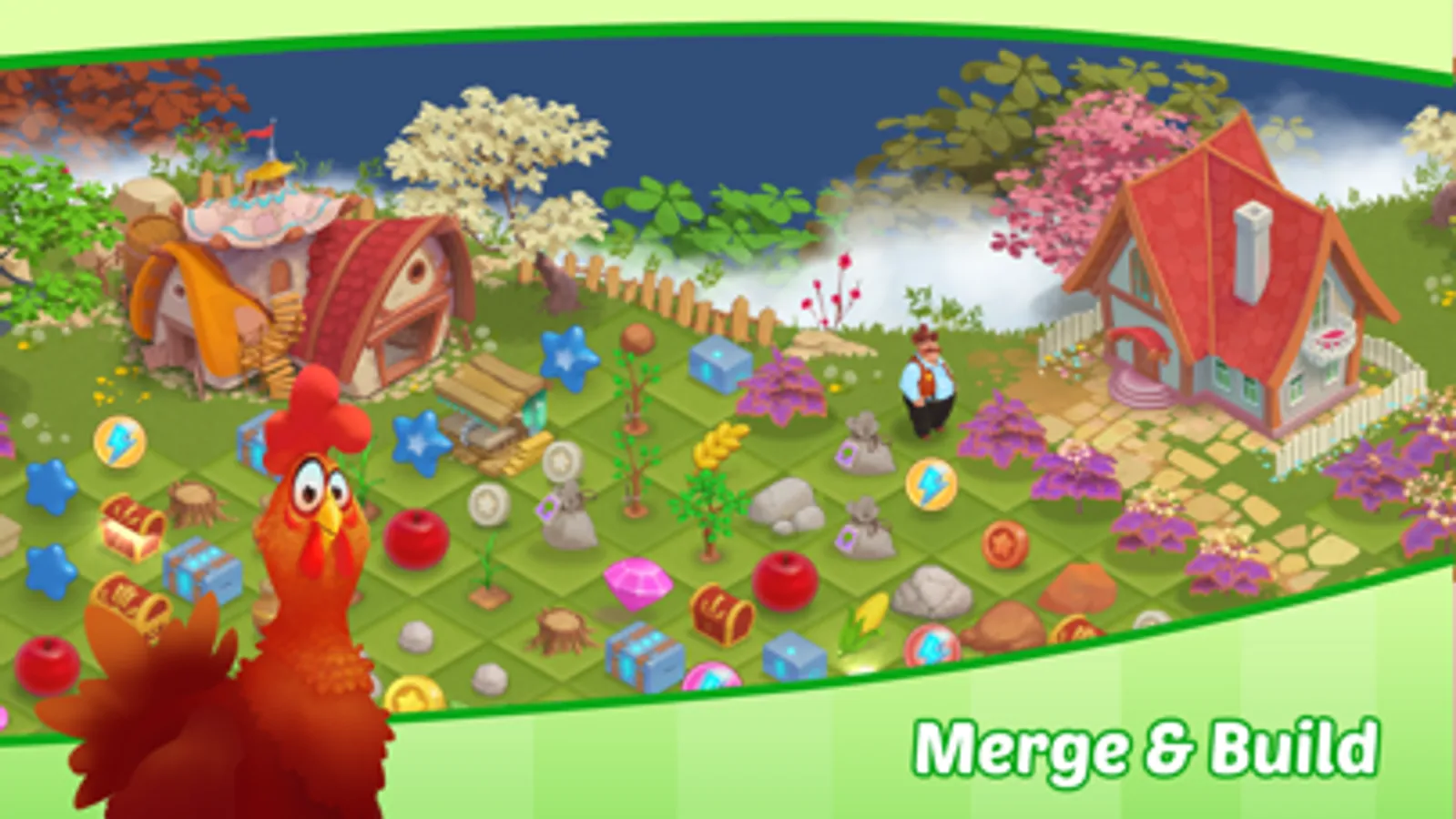 Organize your playing field, collect materials to repair buildings, and grow fruit and vegetables to make food. Upgrade your buildings to speed up production and upgrade your storage to get bonus slots. Collect rare items and open chests to get energy and coins!