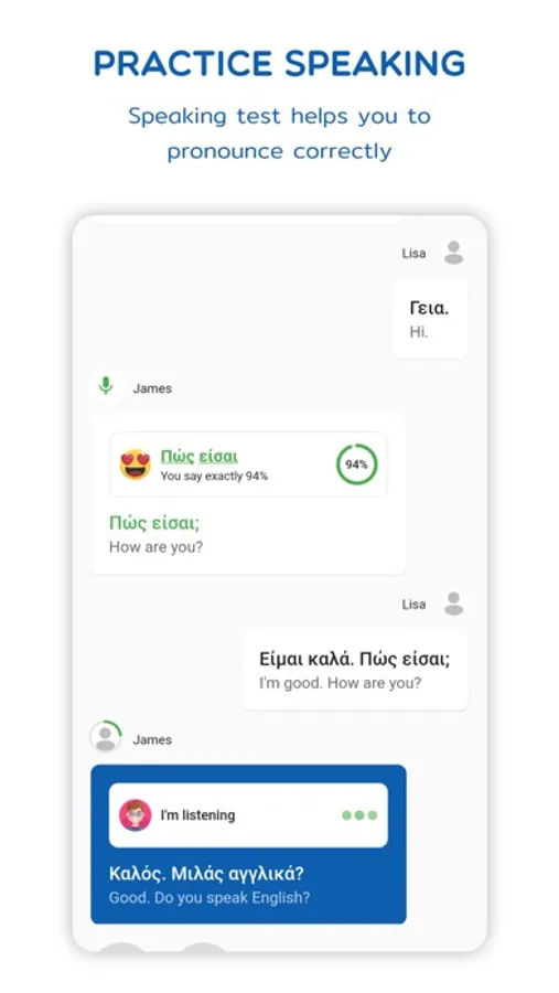With Greek Speak & Listen, you have access to a vast collection of familiar Greek phrases, featuring over 9999 sentences and phrases covering various categories and relevant topics. Our app provides an easy and effective method for you to become a native Greek speaker. Simply listen and repeat, and then record your speech to compare it with the app's native Greek speakers. Repeat this process over and over again while tracking your progress with our supported tools, and you'll see the difference in just a few days.