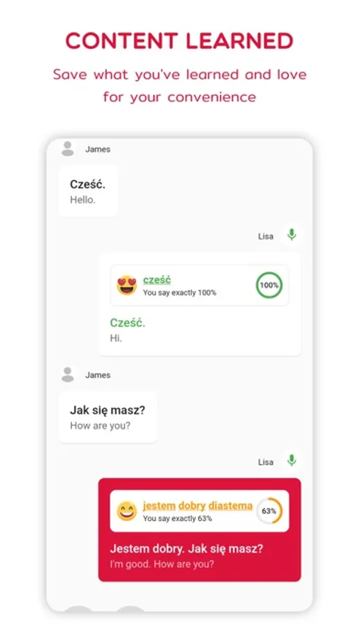 With Polish Speak & Listen, you have access to a vast collection of familiar Polish phrases, featuring over 9999 sentences and phrases covering various categories and relevant topics. Our app provides an easy and effective method for you to become a native Polish speaker. Simply listen and repeat, and then record your speech to compare it with the app's native Polish speakers. Repeat this process over and over again while tracking your progress with our supported tools, and you'll see the difference in just a few days.