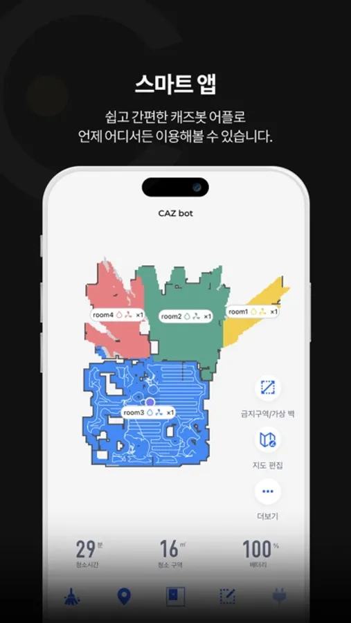 앱의 다양한 기능을 통해 어디서나 CAZbot 로봇청소기를 스마트하고 효율적으로 제어할 수 있습니다.