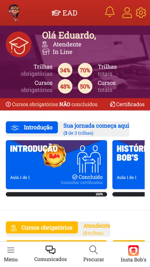Plataforma de ensino a distancia EAD e incentivos para uso exclusivo dos colaboradores dos restaurantes do Bob's. Não destinado ao consumidor.