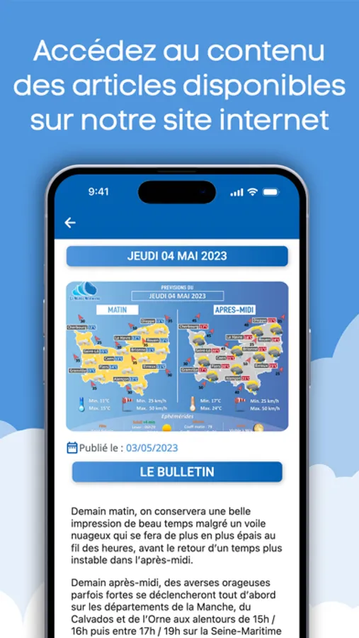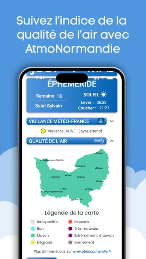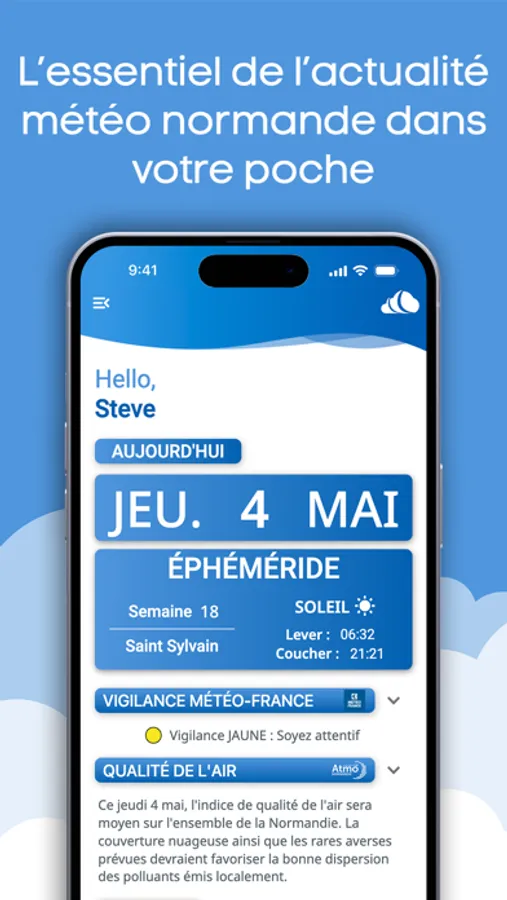 Consultez chaque jour l'application Le Nuage Normand et tenez-vous informés de la météo en Normandie : Date du jour, Éphéméride, Lever / Coucher du soleil, Saint du jour...