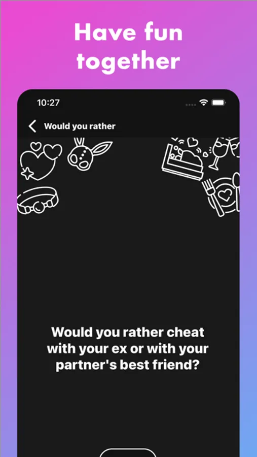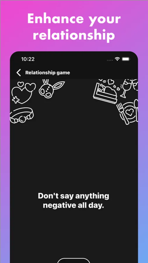 The main goal of the app is to spice up your relationship by providing fun and sexy games/challenges.