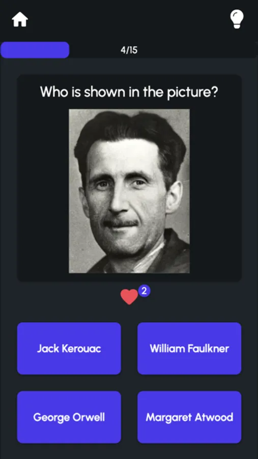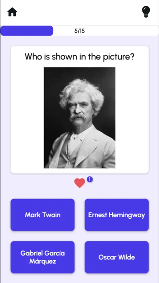Welcome to Literature Quiz - the fascinating quiz game about world-famous writers! Our app offers an entertaining and efficient way to study literature and expand your literary knowledge. With each completed exercise, you earn points that affect your level and ranking. Challenge yourself and compete with other literary enthusiasts to become a leader in the ranking. Share your progress with your friends and enjoy the fun way to pass the time. Download Literature Quiz now and try it for yourself!