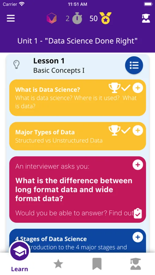 Use the Personal Lesson Planner to pick out just the topics you want to learn about or brush up on. Track statistics on your progress in your personal lesson plan because we know, if you want to be a data scientist, you love statistics!