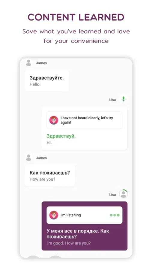 With Russian Speak & Listen, you have access to a vast collection of familiar Russian phrases, featuring over 9999 sentences and phrases covering various categories and relevant topics. Our app provides an easy and effective method for you to become a native Russian speaker. Simply listen and repeat, and then record your speech to compare it with the app's native Russian speakers. Repeat this process over and over again while tracking your progress with our supported tools, and you'll see the difference in just a few days.