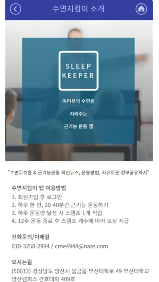 직접 자신의 모습을 보며 상기도 근기능운동을 따라할 수 있는 12주 운동 프로그램으로 구성되어 있으며, 자유게시판을 통해 수면 무호흡과 상기도 근기능운동 관련 정보들을 확인할 수 있으며, 최신소식에는 최근 질병 또는 치료와 관련된 이슈 및 정보를 알 수 있습니다.