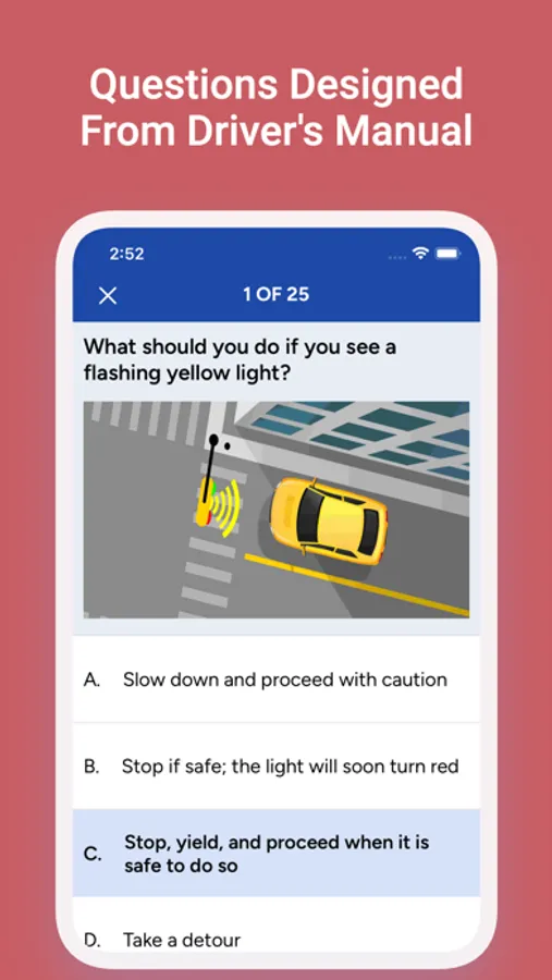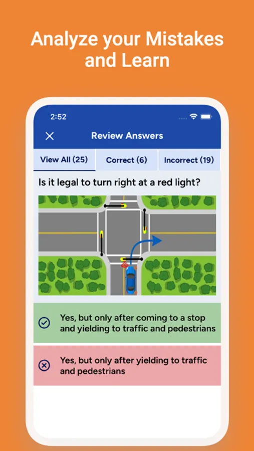 You will get the test result based on the official criteria to pass the Driver’s License Test. You will also be able to find out what questions you've done wrong after taking the test.