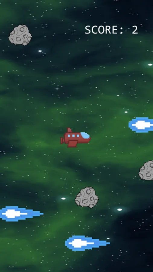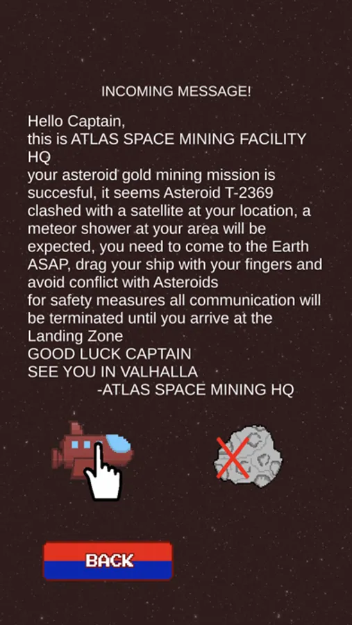 your asteroid gold mining mission is succesful, it seems Asteroid T-2369 clashed with a satellite at your location, a meteor shower at your area will be expected, you need to come to the Earth ASAP, drag your ship with your fingers and avoid conflict with Asteroids