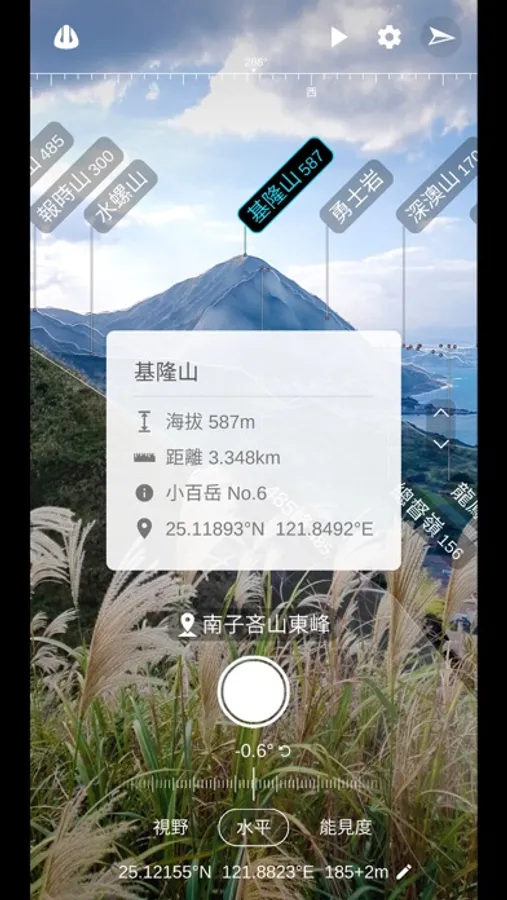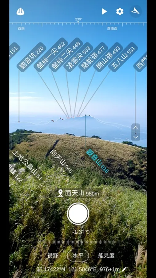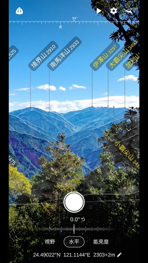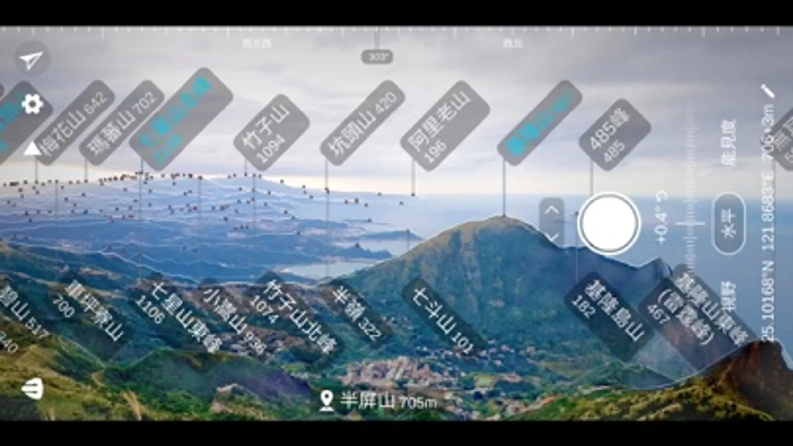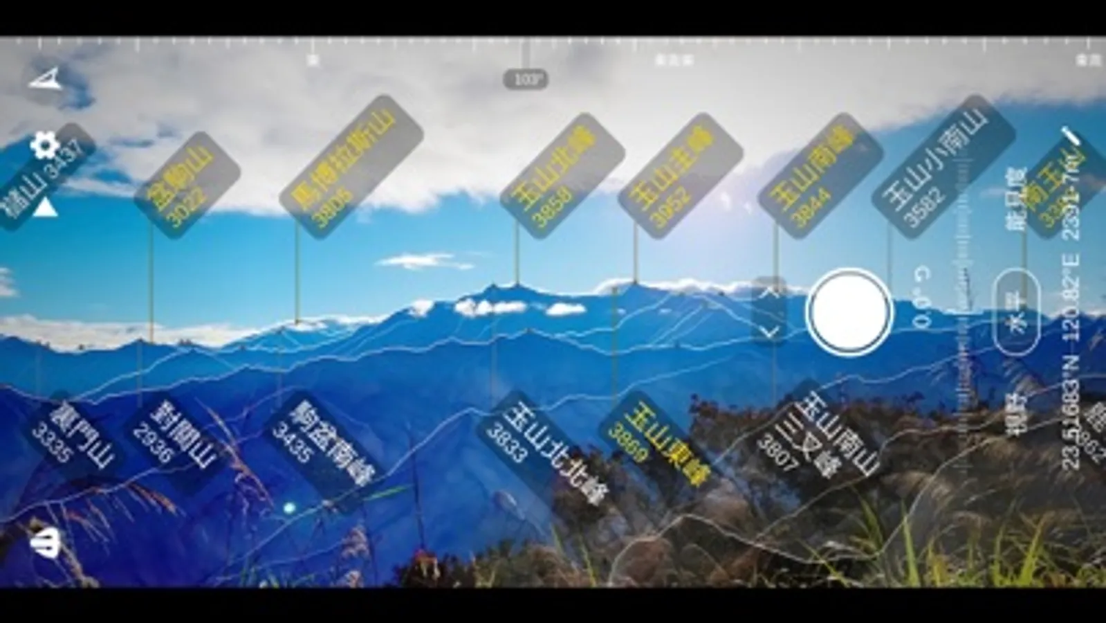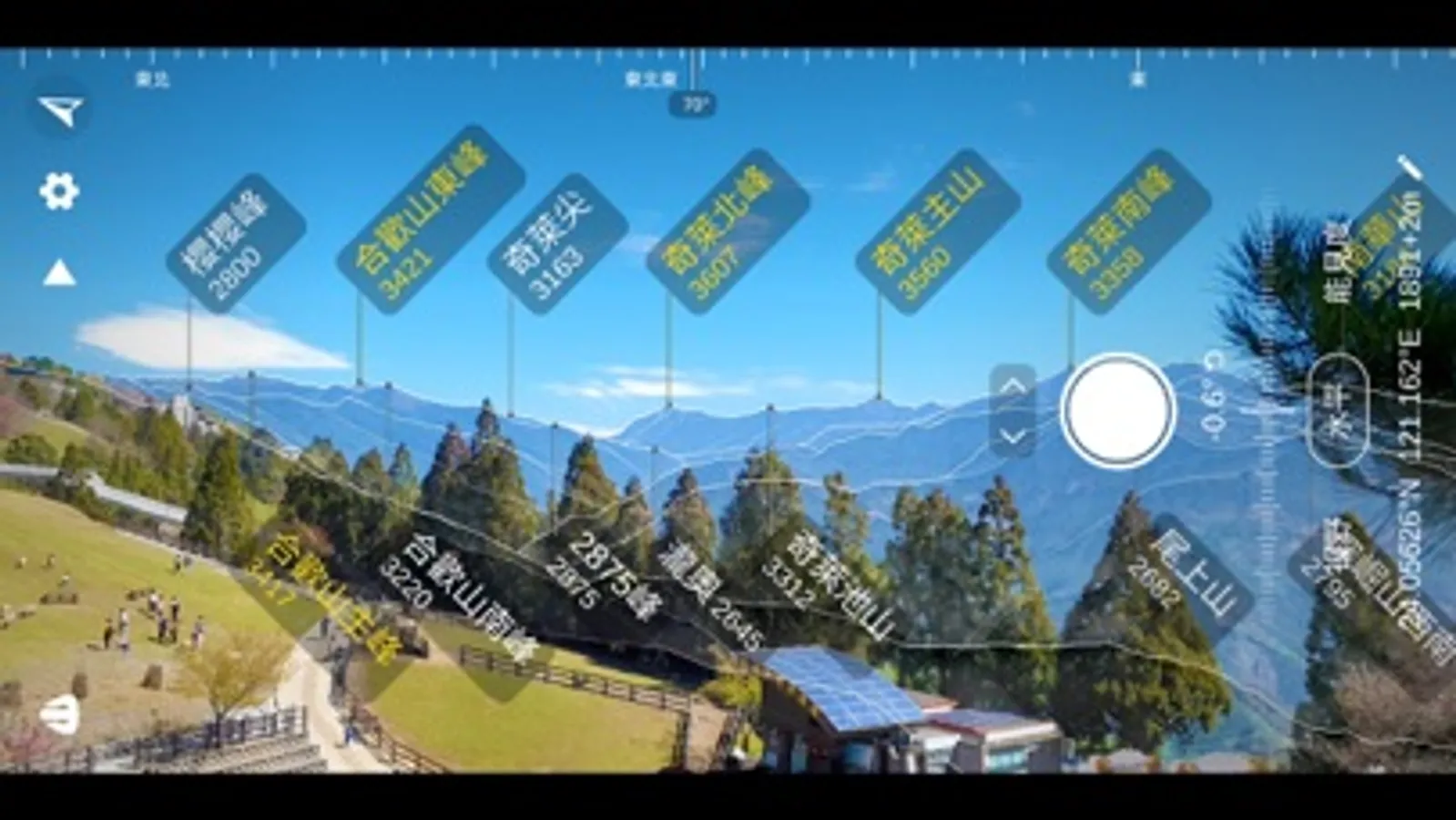 • 拍照:將山景連同山峰名稱及輪廓一起拍攝並儲存至手機相簿