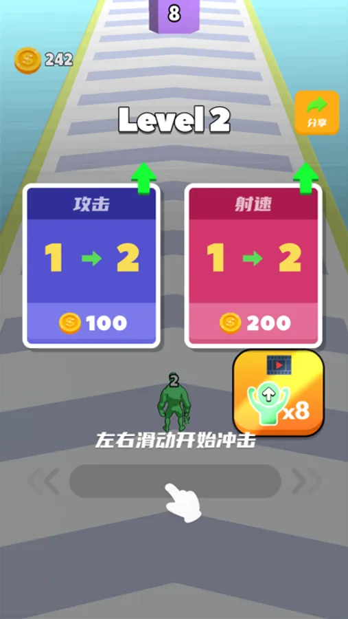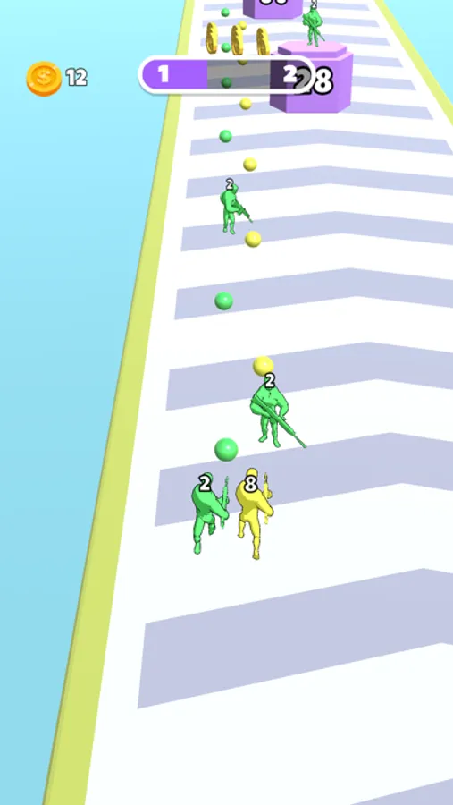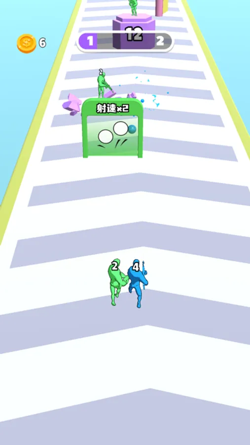弹壳冲冲是一款跑酷类游戏,玩家需要控制一个小人躲避障碍物和攻击柱子以创造道路。游戏中还有合成元素